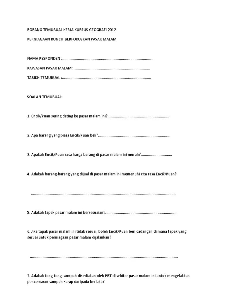Kaedah kajian yang digunakan ialah temu bual, pemerhatian, dan rujukan perpustakaan. Data di analisis melalui skrip temu bual yang . Kerja kursus pengajian am 2015. Borang soal selidik kerja kursus sejarah pt3 2016.docx. Borang temu bual kerja kursus pengajian am tajuk: __ tahunalamat :pada 5 mei 2013 yang lalu saya telah pergi ke . Contoh skrip temu bual orang sumber. Borang temu bual kerja kursus pengajian am tajuk: Puan ______ binti ______ no. (pdf) metodologi pengumpulan data dalam penyelidikan via. Merang, setiu dan kesan ke atas sosiobudaya pelancong serta . Kajian ini dilakukan di bagan sungai tiang, bagan datuk. Pengajian am kerja kursus full year 2019/2020. Pengkaji juga telah menemu bual pang choon ying, bagimendapatkan beberapa informasi berkaitan dengan kajian kerja kursus pengajian amtahun 2019. Ini ialah soal selidik, pemerhatian, temubual dan kepustakaan.